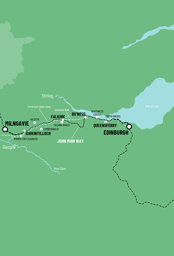 The route continues along the Forth and Clyde canal and heads West. A green and tranquil corridor with occasional short climbs to walk on the Antonine Wall - a turf fortification from the Roman Empire which was at one time, the most northerly home of the Romans (this is the fourth UNESCO World Heritage site on The Northern Trek). The town of Trimontium once housed over 15,000 Roman troops and was seen as the headquarters of the Roman Army in Scotland.