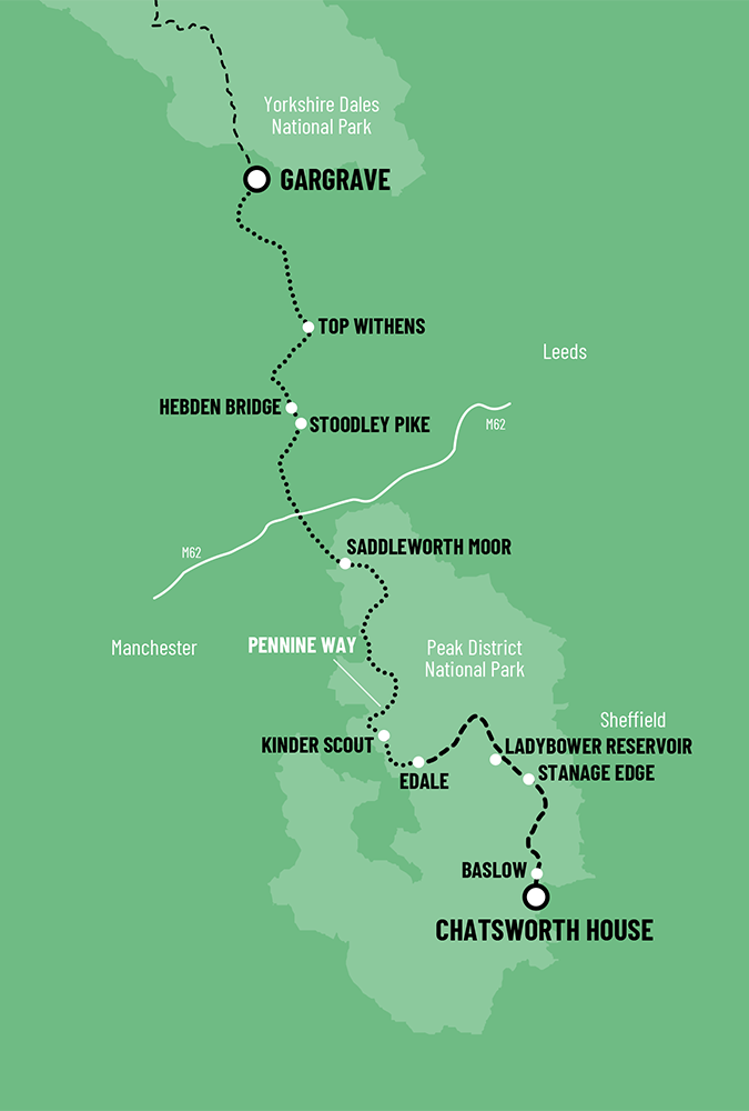 The Northern Trek now follows the iconic Pennine Way up to Kinder Scout, with breathtaking views of Derbyshire and of Kinder Downfall. As you climb Jacob's ladder out of Edale, the dramatic scenery of the Dark Peak unfolds -