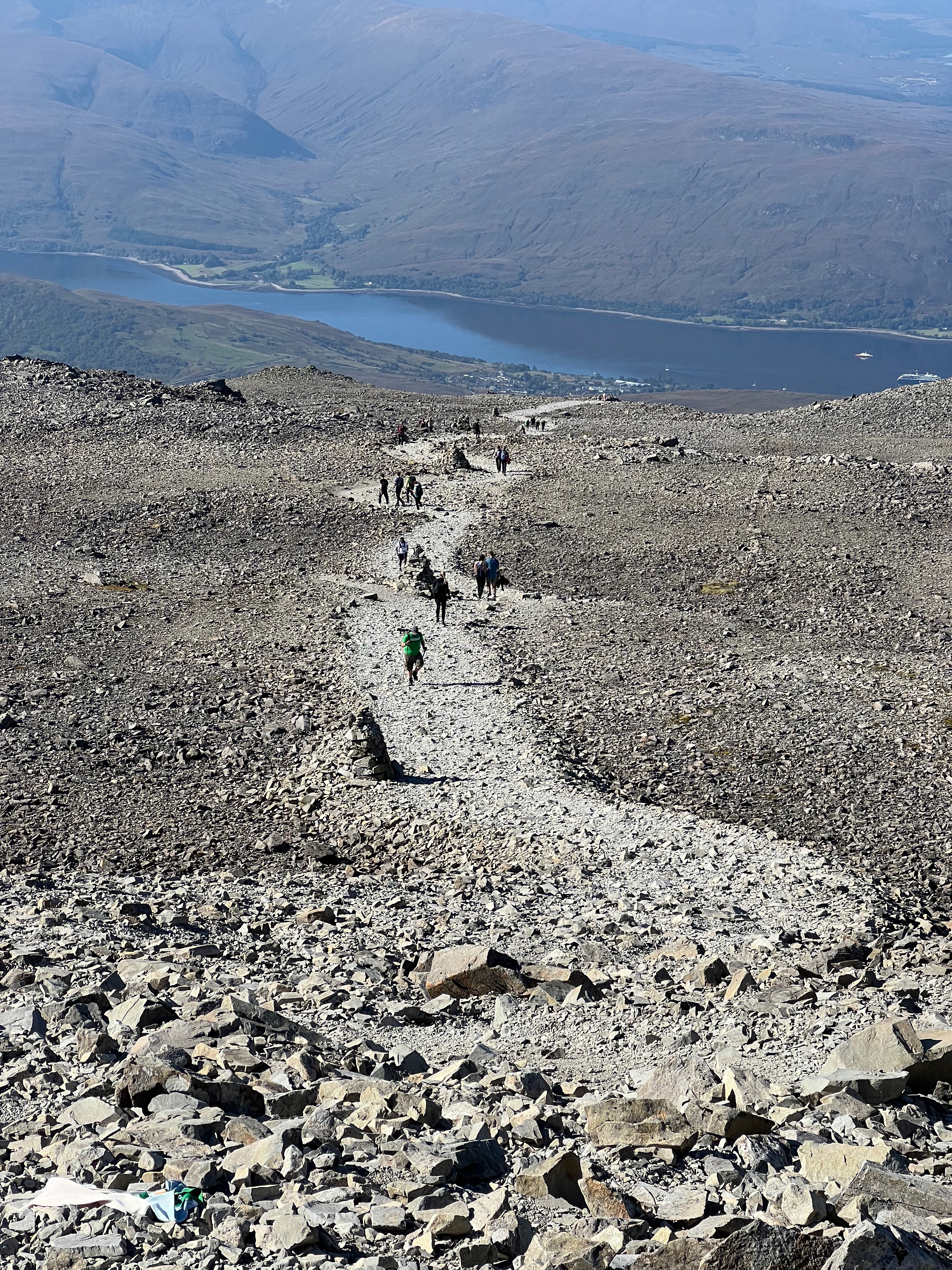 Rising majestically above the valley and topped with snow. The highest mountain in the UK at 4418ft (1344m). That feeling that the finish is close at hand, is now with you.