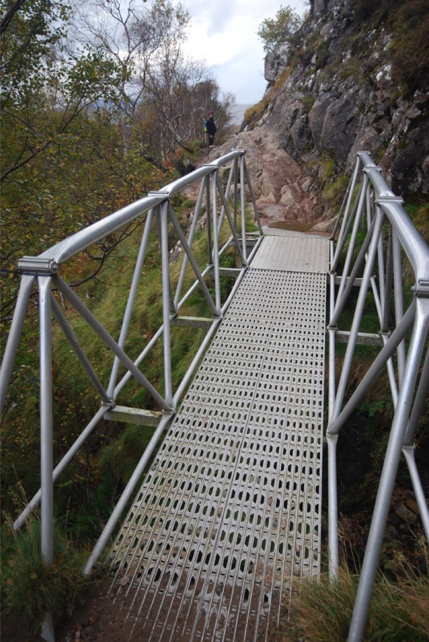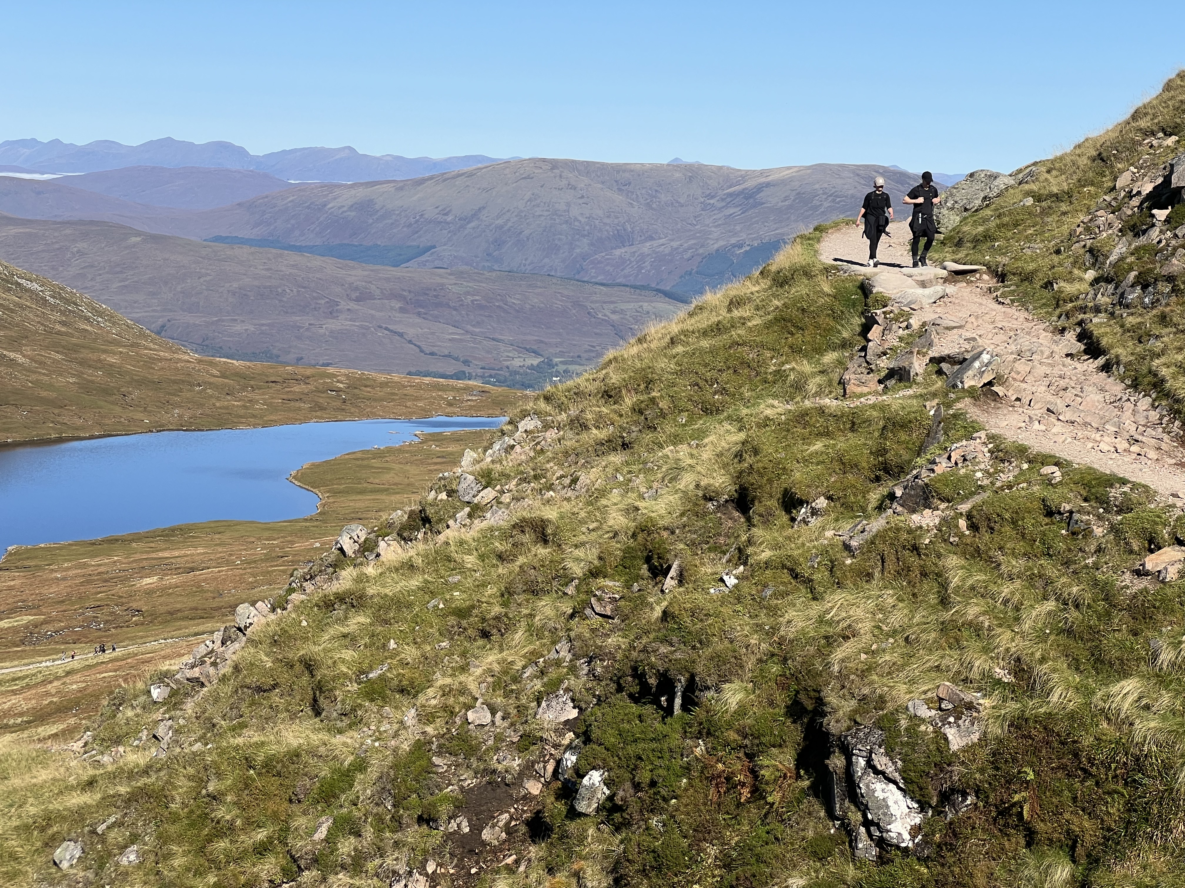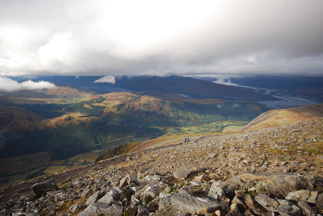 Start from either of the two car parks at the Visitor Centre or from Achintee House. There is free parking on the road side near the Youth Hostel. The path is easy to follow and clearly marked. The first 1000 feet (304m) is both steep and quick to climb. The terrain flattens briefly by the loch (Lochen Meall an t-Suidhe) but soon begins to rise again with wonderful views back to Fort William and Glen Nevis.